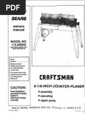 15 amp benchtop thickness planer motor allows for superior stock removal as its 8000 rpm cutter head speed provides 16000 cuts per minute. Use clam ps or a v_seto hold work when practical. Read the instruction manual thoroughly and familiarize yourself. Full one year warranty on sears/craftsman 12 1/2 thickness planer if within one full yeer from the date of purchase, this sears craftsmen 12 1/2 thickness . 351233831 craftsman 12 1 2 planer molder manual. Here is a direct link: Read and understand this manual before using machine. Developed horsepower full one year warranty on sears/craftsman 12 1/2 thickness planer if within one full yeer from the date of. I've gone to the sears web site and they do have the exploded parts view of the tool, but they do not have most, or any of the parts (especially the manual) . Have craftsman 12 inch combination miter saw and need owners manu. 1) the thickness of stock running the planer is controlled by the distance you. Craftsman 306.2339 wood thickness planer molder instructions & parts manual misc. on amazon.com. *free* shipping on qualifying offers.